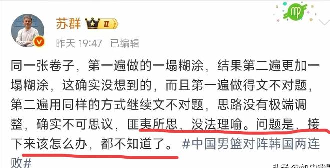 一时间男篮沦为众矢之的,甚至有网友评价:“男篮已经开始男足化了”。